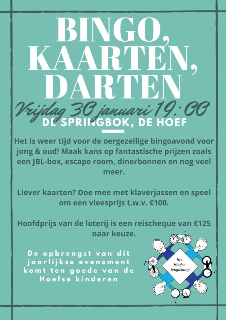 Zet βm alvast in je agenda, want vrijdag 30 januari 2026 wordt het weer ouderwets gezellig! Het Hoefse Jeugdkamp organiseert een avond vol kaarten, kienen en darten β voor jong en oud, fanatiek of gewoon voor de gezelligheid.
